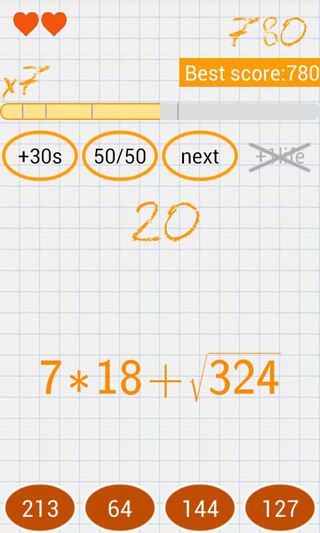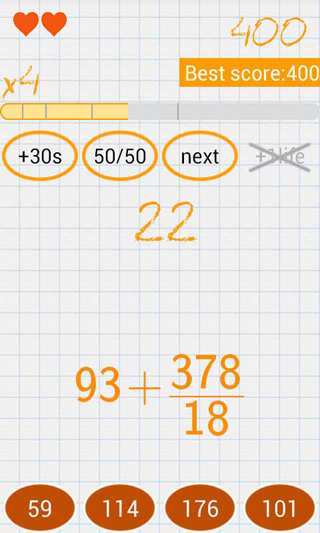1.游戲畫面采用了當(dāng)下流行的涂鴉風(fēng)格,游戲方式簡單,玩家只要根據(jù)屏幕中央的數(shù)學(xué)題目,選出正確的答案即可。2.游戲難度從低到高,想拿到高分可不容易。屏幕上方有一個獎勵條,當(dāng)玩家答題速度快,且連續(xù)答對的話,獎勵條就會增長,得到的分數(shù)就會有加成。