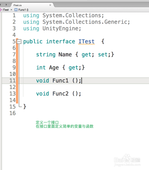 在打開的“ITest”腳本上進(jìn)行代碼編輯,首先設(shè)置為接口,然后在接口向里面設(shè)置兩個變量,再在設(shè)置兩個函數(shù),具體代碼及代碼說明如下圖