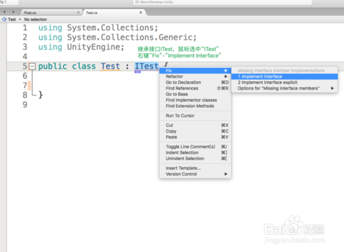 再打開腳本“Test”,首先繼承接口“ITest”,然后選中“ITest”字符,右鍵鼠標(biāo),在彈出的菜單里面選中“Fix”-“Implement interface”,具體如下圖
