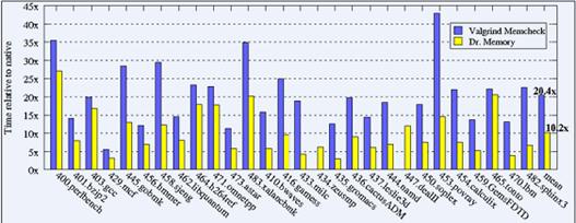 Dr. Memory 建立在 DynamoRIO 這個(gè)動(dòng)態(tài)二進(jìn)制插樁平臺(tái)上。動(dòng)態(tài)監(jiān)測(cè)程序的運(yùn)行,并對(duì)內(nèi)存訪問相關(guān)的執(zhí)行代碼進(jìn)行動(dòng)態(tài)修改,記錄其行為,并采用先進(jìn)的算法進(jìn)行錯(cuò)誤檢查。根據(jù) DrMemory 開發(fā)人員發(fā)表在 CGO 2011上的論文 Practical Memory Checking with Dr. Memory,DrMemory 對(duì)程序的正常執(zhí)行影響較小,這在同類工具中是比較領(lǐng)先的。其 performance 和 Valgrind 的比較如圖 1 所示(圖片源自 DrMemory 主頁(yè)):