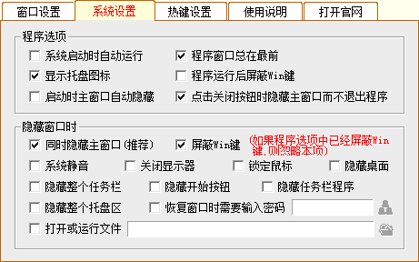 10.可以設(shè)置運行后自動隱藏,以及設(shè)置程序運行后是否顯示托盤圖標。因為,只有隱藏好主程序自身,才能更好地隱藏其它窗口。