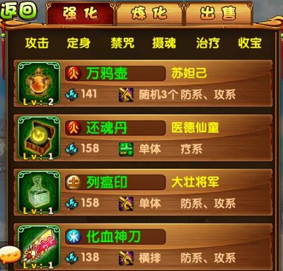 法寶按鈕中,可以對(duì)武器進(jìn)行煉化,和出售。武器好不好,就在這里決定了!所有的武器列表都在這里顯示出來了。