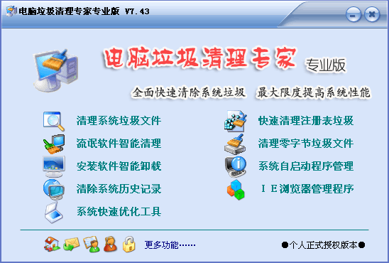 《電腦垃圾清理專家》是一款清理windows系統(tǒng)垃圾信息或者垃圾文件的強(qiáng)大的傻瓜式軟件。它可以清理各種注冊表垃圾信息、網(wǎng)絡(luò)垃圾,網(wǎng)絡(luò)痕跡,系統(tǒng)垃圾文件和各種軟件安裝卸載所殘留的垃圾。用戶只需在主界面選擇要清理的項(xiàng)目即可,按照提示即可輕松完成清理工作。