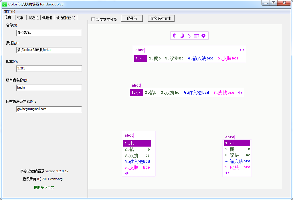需要注意的是Colorful皮膚編輯器只能和多多輸入法生成器配合使用,并有相關(guān)論壇可分享網(wǎng)友的皮膚模板。