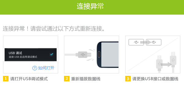 連接異常,請嘗試通過以下方式重新連接1.請打開手機USB調(diào)試模式(往下看)
