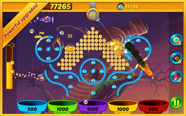 游戲操作簡(jiǎn)單,玩家只需通過移動(dòng)的方式調(diào)整、選擇好炮彈將要發(fā)射的角度,將炮彈發(fā)射出去即可,融入一定物理原理玩法的它,因?yàn)榕菖莸膹椥?,炮彈?huì)隨機(jī)不斷四處亂撞,最終掉入下方的碗中,分?jǐn)?shù)由你在空中撞擊的泡泡為主,當(dāng)然最后掉落碗中的分?jǐn)?shù)也很重要。