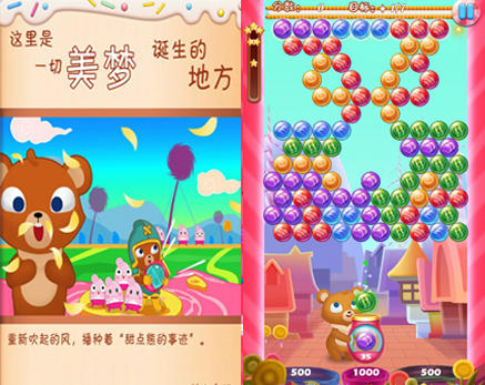 游戲的玩法其實(shí)就是經(jīng)典的泡泡龍玩法,簡(jiǎn)單的操作方式,大家只需通過(guò)滑動(dòng)屏幕,根據(jù)虛擬的輔助線來(lái)將球拋射出去,撞擊到三個(gè)或者三個(gè)以上相同色系的球體上,即可達(dá)到消除效果,點(diǎn)擊小熊手中的糖果罐,還可以切換糖果的顏色和種類。