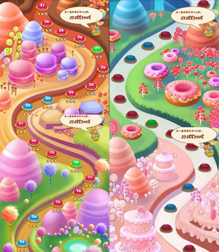 甜膩粉嫩糖果世界本作夢(mèng)幻的卡通畫(huà)面,西瓜相信只要是女生都無(wú)法抗拒,在童話世界般的場(chǎng)景中,粉嫩嫩的色調(diào)讓人陶醉,滿屏幕的甜食,小吃貨們,有沒(méi)有一種口水快要流下來(lái)的趕腳,令人意外的是,消除時(shí)的特效比較普通,并沒(méi)有西瓜想象中那般華麗。