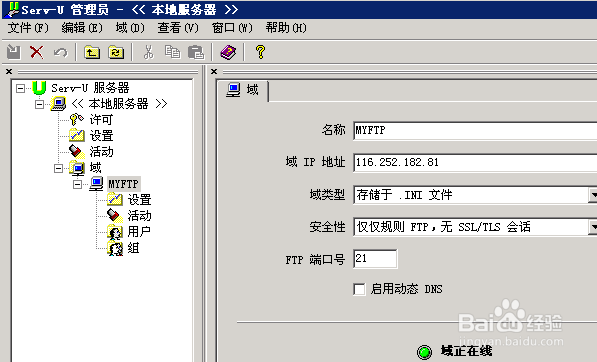 2.展開Serv-U服務(wù)器,找到“域”,如果已經(jīng)建立有域,可跳到建立用戶;如果沒有“域”則新建一個域.如下圖