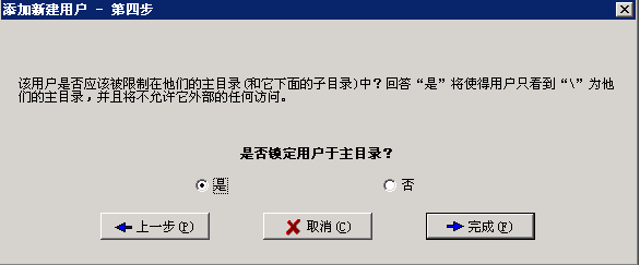 注:如果選中鎖定用戶至根目錄后則此根目錄的權(quán)限決定了 根目錄下所有目錄的權(quán)限。如果根目錄下有不同的目錄,不同的目錄有不同的權(quán)限的話,請勿選中鎖定用戶至根目錄。