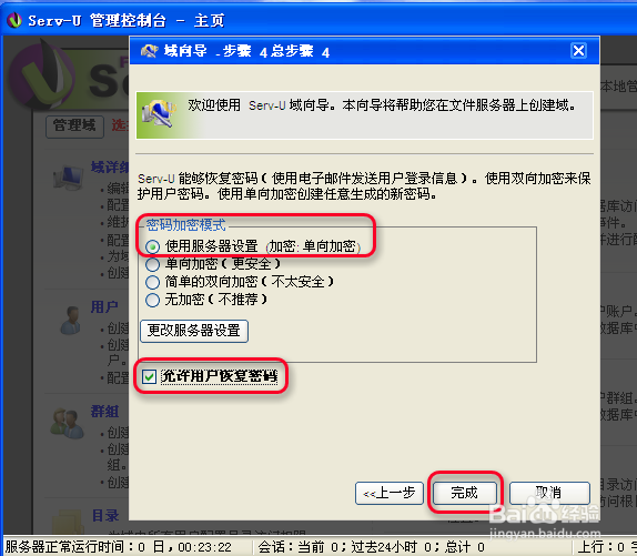 點擊下一步,進入服務(wù)器安全設(shè)置,默認使用服務(wù)器設(shè)置,即單向加密,比較安全,如果允許用戶自己修改和恢復密碼,勾選允許用戶恢復密碼,設(shè)置好后,點完成,如下圖所示: