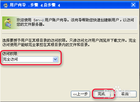 點下一步后,會出現(xiàn)權(quán)限設(shè)置對話框,如果你只想讓你的用戶查收不準寫入,就選擇只讀用戶,如果想讓它上傳,就選完全訪問,然后點完成,如下圖所示: