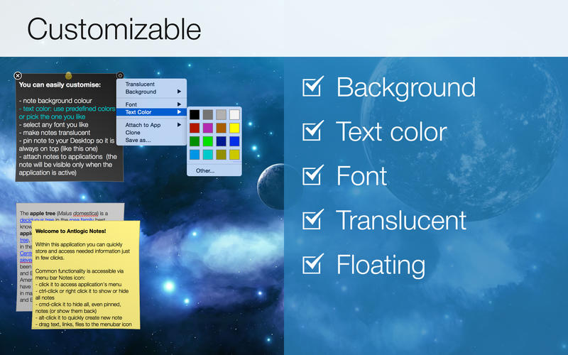 除了基本的記事功能外,它還具備有以下特殊功能:便條紙的顏色、尺寸、邊框都可設(shè)定調(diào)整,并可在桌面上四處貼??梢宰孕性O(shè)定文字的字體、顏色及大小,而且內(nèi)容若包含有URL或郵件位址,還可直接透過關(guān)連軟件進(jìn)行連結(jié)或開啟。