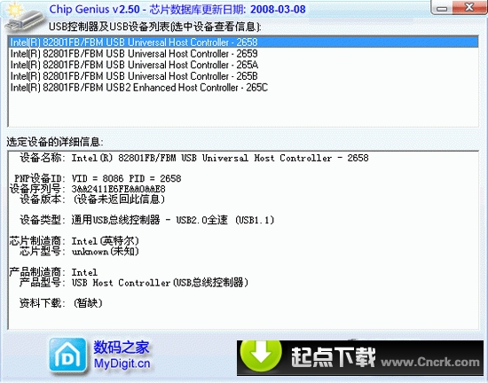 ChipGenius是一款USB設(shè)備芯片型號(hào)檢測(cè)工具,可以自動(dòng)查詢(xún)U盤(pán)、MP3/MP4、讀卡器、移動(dòng)硬盤(pán)等的主控芯片型號(hào)、制造商、品牌、并提供相關(guān)資料下載地址。當(dāng)然也可以查詢(xún)USB設(shè)備的VID/PID信息、設(shè)備名稱(chēng)、序列號(hào)、設(shè)備版本等。