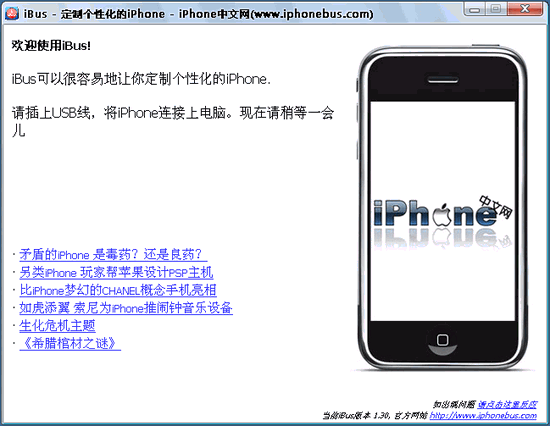 iPhone iBus V2.0 簡體中文綠色免費版 iBus是一款基于windows操作系統(tǒng)下的中文版iPhone多功能第三方軟件,它不僅可以實現(xiàn)鈴聲、電子書、模擬器游戲和任意文件的上傳功能,還具備自動安裝所有iPhone第三方軟件的強大優(yōu)點,絕對是新手必備的一款iPhone個性化的實用工具。