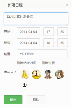用Worktile組織高效會議1、利用【日程】新建會議,比如【四月運營計劃會議】,然后確定時間、地點以及邀請成員;