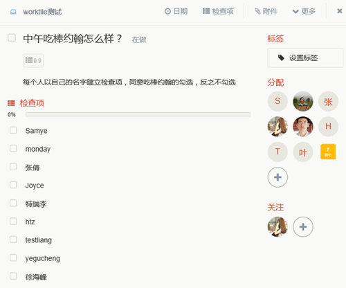 2、在任務(wù)描述中建立投票規(guī)則:每個人以自己的名字建立檢查項,同意吃棒約翰的勾選,反之不勾選;