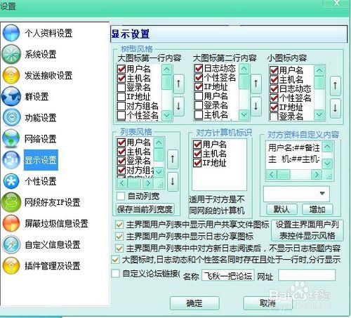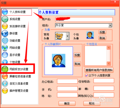 4、打開(kāi)設(shè)置界面后,我們可以先修改一下自己的名稱和組,默認(rèn)用戶名是電腦的登錄用戶,設(shè)置好后,選擇左側(cè)的“網(wǎng)段好友IP設(shè)置”,打開(kāi)“網(wǎng)段好友IP設(shè)置”界面。輸入你好友的網(wǎng)段地址,點(diǎn)擊增加。