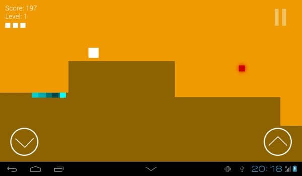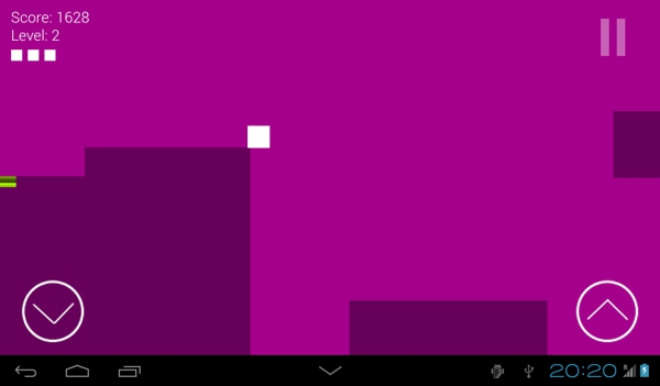 《跳躍的方塊 Jump Cube, Jump》是一款簡潔的橫版跑酷類小游戲。玩家需要控制一個小方塊,來穿越各種障礙以獲得更多的分?jǐn)?shù)。屏幕左邊的按鈕讓小方塊變得隱身,這樣即使穿墻而過也不會game over,但是不能同時收集硬幣和獎勵。右邊的按鈕可以用來跳躍。你還能吃到各種道具。比如黃色的可以加分,白色的可以增加生命,紅色可以讓速度變慢等等??靵碓囋嚢蓗