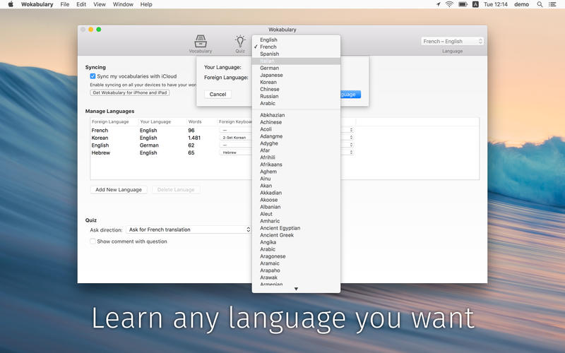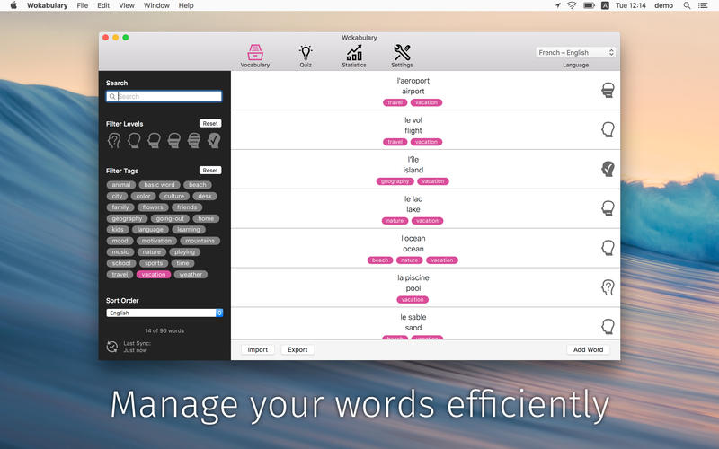 【3】Wokabulary是免費(fèi)的基本版本的使用,使您可以管理一個(gè)語(yǔ)言。您可以使用完整的學(xué)習(xí)和測(cè)驗(yàn)?zāi)J?,并從互?lián)網(wǎng)上導(dǎo)入生詞。完整版可讓多國(guó)語(yǔ)言,并增加了很酷的功能,如同步,統(tǒng)計(jì)以及導(dǎo)入/導(dǎo)出功能。