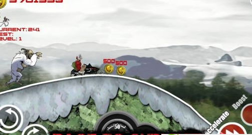 《雪怪競(jìng)速 Monster Hill Racing》是一款經(jīng)典好玩的休閑游戲。到極北冰原去冒險(xiǎn),卻意外惹上了一只莫名的雪怪。它氣勢(shì)洶洶,仿佛隨時(shí)要將你撕碎一般。沒辦法,快開著你的雪橇飛車,逃脫它的追逐吧~游戲操作也較為簡(jiǎn)單,屏幕右下角是加速按鈕,為了保命,最好一直按著它!左下角是調(diào)節(jié)平衡的按鈕,免得在飛馳的時(shí)候失去平衡而跌倒!【游戲玩法】
