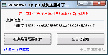 本工具由土豆吧博客原創(chuàng)開發(fā),"uxtheme.Dll"補(bǔ)丁由其他高手提供,本工具只為不懂如何手動的網(wǎng)友提供了更為便捷了一個利器