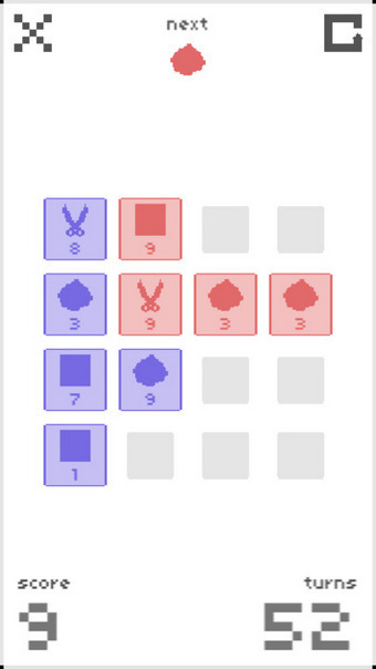 石頭砸剪刀,剪刀剪掉布,布包裹石頭”就是這個游戲的最基本的玩法。你可以朝任何方向掃動來將藍色色塊撞向紅色色塊來提升你的分?jǐn)?shù)。石頭剪刀布小三游戲包含三種游戲模式(單人模式、對抗AI和對抗玩家),并可以限定于固定回合中游戲(40、80或160輪)或無盡次數(shù)。