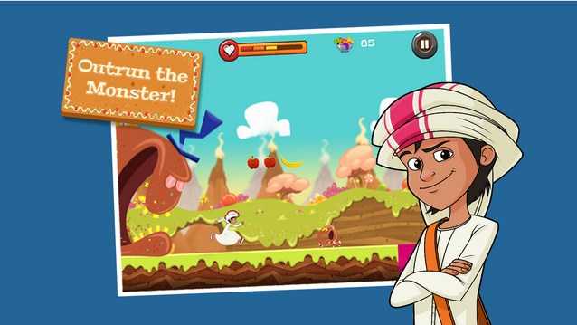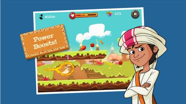 曼蘇爾跑酷游戲中以健康食品來提升玩家的能力;游戲畫面卡通,帶有一定的異域風(fēng)情;