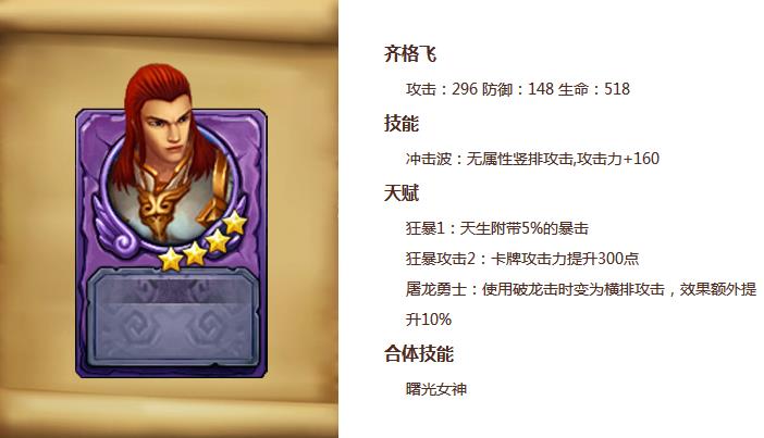 齊格飛是北歐神話中登場(chǎng)的屠龍勇士,沐浴龍血后刀槍不入,乍一聽背景故事像是個(gè)肉盾類英雄,其實(shí)一點(diǎn)也不硬,從初始技能的傷害值,到初始三國(guó)數(shù)值,都比我們鐘愛的猴哥低一點(diǎn),但這并不妨礙他成為一個(gè)好用的英雄,畢竟,人家是新手任務(wù)中用KO積分兌換的,你不想要都不行。合體技能中的曙光女神,只需與初始陣容中的歐若拉和斯巴達(dá)戰(zhàn)士同時(shí)在場(chǎng)即可釋放,威力比三連強(qiáng)襲高了500點(diǎn),相當(dāng)不錯(cuò)。