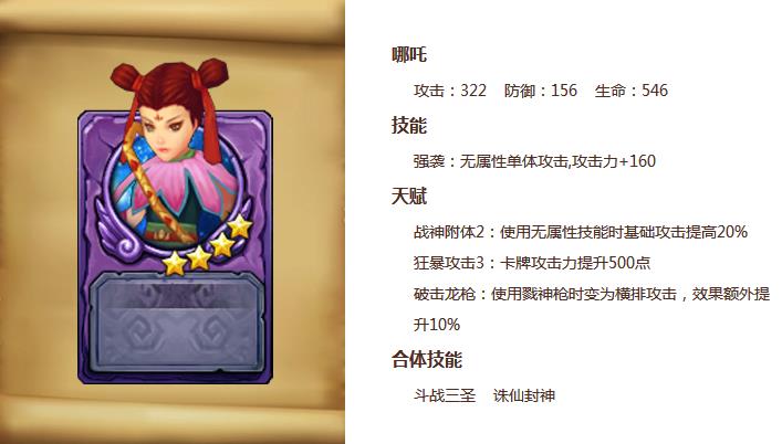 又一位中國(guó)神話中的小將來到了游戲中,關(guān)于哪吒各種翻江倒海、撥皮抽筋的頑劣事跡這里不再贅述了。首先,初始技能攻擊力增加雖然高達(dá)160點(diǎn),但畢竟是個(gè)單體技能??磥碓凇侗娚裰狻分?,三太子也依然擺脫不了被孫悟空壓制的命運(yùn),唯一的亮點(diǎn)是后面的合體技能仙封神,可以對(duì)橫排敵人造成釋放英雄總攻擊力5%+2000點(diǎn)的傷害。
