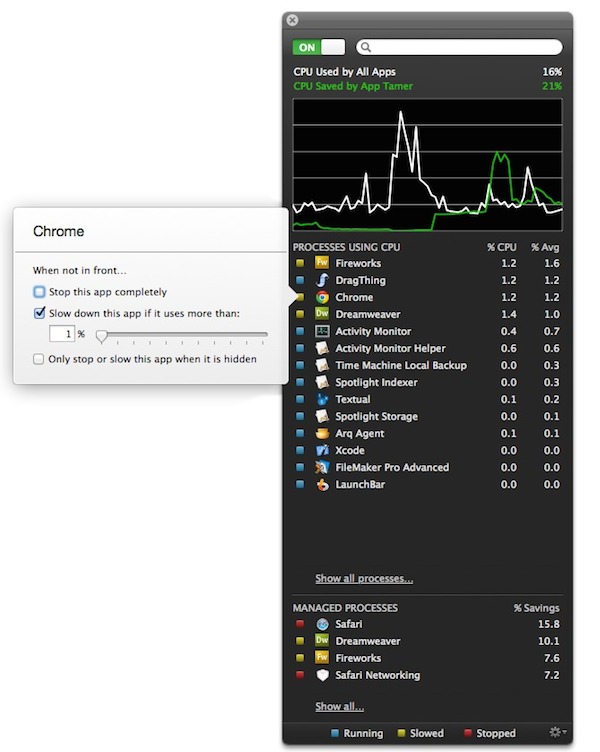 App Tamer的假設(shè)使用情境是當(dāng)我們同時(shí)執(zhí)行多種軟件,如瀏覽器、繪圖程序…等等,有時(shí)Photoshop作圖累了,切換至瀏覽器找尋資料,此時(shí),后臺(tái)中閑置的Photoshop程序仍會(huì)短暫使用CPU資源,App Tamer就是設(shè)計(jì)來(lái)「冰凍」這些暫時(shí)不使用的軟件。當(dāng)我們想繼續(xù)工作時(shí),切換回Photoshop視窗時(shí),App Tamer會(huì)釋放冷凍中的Photoshop,讓我們繼續(xù)工作。