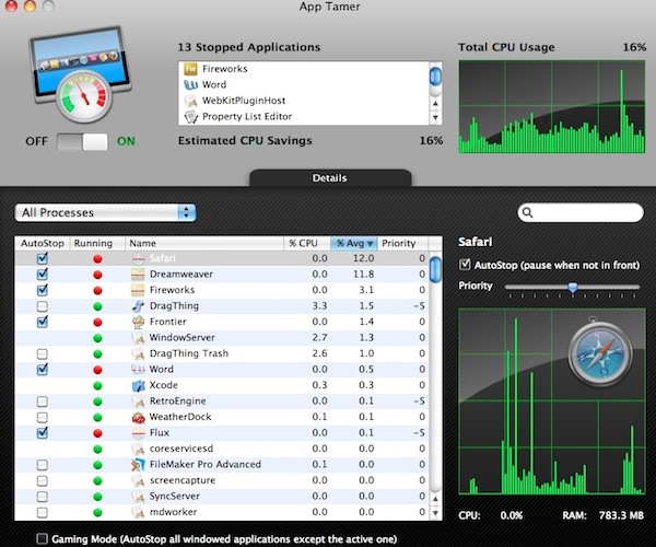 App Tamer for mac是一款幫助用戶管理電池的專用軟件,它可以暫停常駐程序、延長(zhǎng)電池續(xù)航力,在電量不足的情況下就可以開(kāi)啟了,非常不錯(cuò)的工具,大家值得下載。