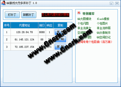 1、多QQ大廳實現(xiàn)多開,支持所有版本 2、提供最快QQ游戲代理代理地址,解決“本房間不允許相同IP用戶進(jìn)入,請您換一個房間玩游戲!”的問題。 3、提供QQ游戲代理使用方法幫助。