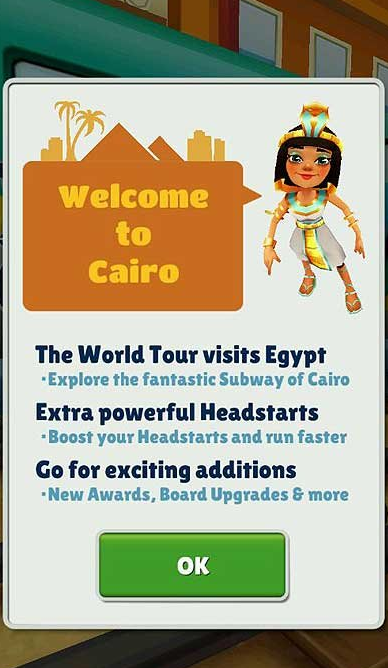 地鐵跑酷小游戲有大驚喜開羅更新,新滑板,和兩個加入功能的舊滑板,一個彈跳一個加速,效果和原來的一樣。游戲中的場景有左右兩邊,左邊是比較具有特色的土房子加陶瓷罐子,而右邊的房子也是非常棒。