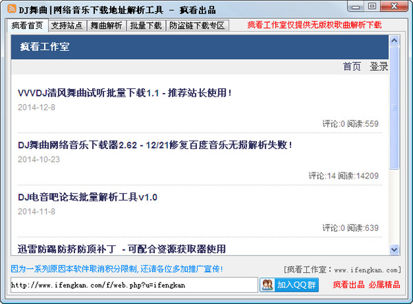 DJ網(wǎng)絡(luò)音樂下載地址解析工具是一款非常好用的DJ舞曲網(wǎng)絡(luò)音樂下載地址解析工具。它可支持40多個(gè)DJ舞曲網(wǎng)站,后續(xù)會(huì)不斷添加更多新的舞曲站點(diǎn)。有了它,再也不用擔(dān)心DJ網(wǎng)站下載音樂需要資源比了。
