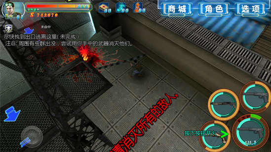 4.右下角是你的武器和虛擬攻擊鍵,你可以選擇你的武器,對(duì)僵尸發(fā)動(dòng)攻擊,到僵尸靠近你時(shí),準(zhǔn)信會(huì)自動(dòng)鎖定僵尸