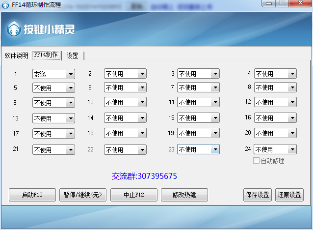最終幻想14生產(chǎn)系輔助是為同名大型3D角色扮演游戲提供的輔助工具,可以幫助玩家快速的實(shí)現(xiàn)自動循環(huán)點(diǎn)擊技能,制作物品時(shí)使用等多種功能,幫助玩家在游戲中有更加出色的發(fā)揮。