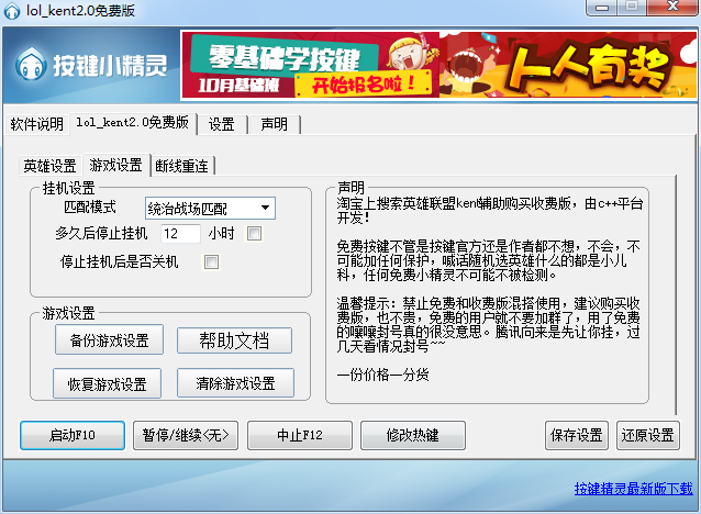 lol kent掛機(jī)腳本完全模擬人工操作,不是外掛,不會(huì)封號(hào),還支持掛機(jī)完成后自動(dòng)關(guān)機(jī)功能,是英雄聯(lián)盟玩家必備的掛機(jī)腳本軟件。