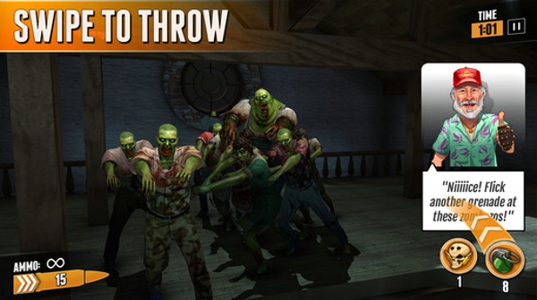 游戲的操作不是常規(guī)的使用虛擬按鍵來控制方向和射擊,而是通過點擊屏幕射擊,按住屏幕來瞄準(zhǔn)。開發(fā)團隊認(rèn)為,這種操作相對虛擬按鍵更能增強玩家的代入感。游戲側(cè)重快節(jié)奏擊殺成堆的僵尸,而探索地圖的內(nèi)容則相對較少。