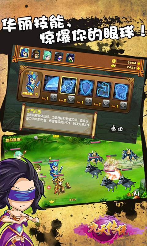 九天傳說(shuō)破解版游戲畫(huà)風(fēng)只能用“質(zhì)樸”二字來(lái)形容了。Q版的人物造型,扁平童話(huà)的背景色彩,使村莊看起來(lái)愈發(fā)的寧?kù)o、和諧。不過(guò)質(zhì)樸村莊里面,住著的村民,嘴可是利的狠。各種狂轟亂炸的吐槽游戲,還有怪物亂入的自夸搞怪,讓你完全忘記了你是在執(zhí)行兩界交戰(zhàn)的重任。在翠綠草原上與怪物你來(lái)我往的攻擊幾下,更像是春游踏青輕松愜意。不要看游戲容量不大,但是該有的系統(tǒng)設(shè)計(jì)還算是很齊全的。單單的英雄站位布陣,就大有學(xué)問(wèn)。排列時(shí)不僅要考慮每個(gè)英雄的屬性特點(diǎn),每種陣型還有著不同的加成。動(dòng)動(dòng)腦筋,小小的玩法也有無(wú)窮樂(lè)趣。雖然裝備系統(tǒng)在游戲中并不太搶眼,不過(guò)基本的品質(zhì)劃分,強(qiáng)化屬性什么的,也是不會(huì)缺少。