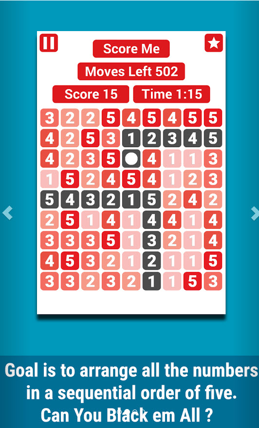 五連移是個扣人心弦的簡單的免費益智游戲。游戲的目標(biāo)是將9乘9的棋盤內(nèi)所有的數(shù)字都以1到5的順序排出來,水平或垂直,順序或倒序均可。【游戲玩法】