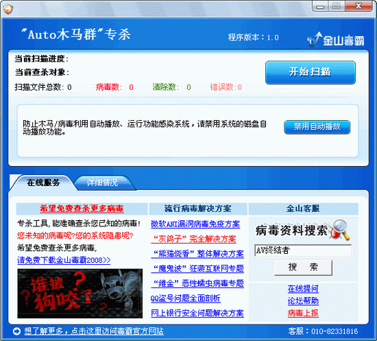 您的位置:起點(diǎn)軟件下載電腦軟件系統(tǒng)軟件金山AUTO木馬群專(zhuān)殺工具 V1.4 簡(jiǎn)體中文綠色免費(fèi)版