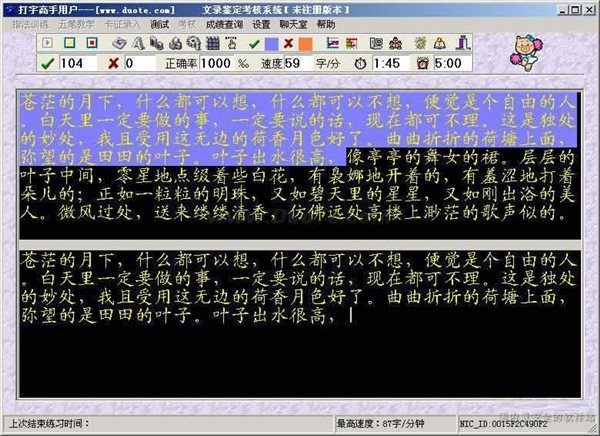 2、中、英文測試,實(shí)時(shí)顯示速度、正確率,并自動(dòng)計(jì)算綜合得分;
