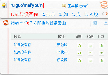 這一項同類產品中也有做到,如拼音加加。但搜狗拼音將許多符號表情也整合進詞庫,如輸入“haha”得到“^_^”。另外還有提供一些用戶自定義的縮寫,如輸入“QQ”,則顯示“我的QQ號是XXXXXX”等。