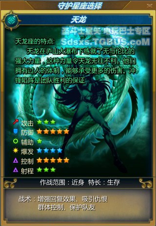 天龍座是一個(gè)隊(duì)伍的核心,在副本或者野外與BOSS戰(zhàn)斗時(shí),需要依靠高防御的天龍座吸引BOSS的仇恨,承受BOSS的傷害保護(hù)其他隊(duì)伍成員不受怪物攻擊。
