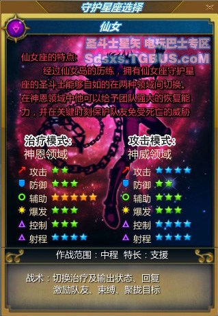 仙女座經(jīng)過在仙女島的刻苦訓(xùn)練,除了具有一定的攻擊能力之外,也是青銅圣斗士中唯一具有治療隊(duì)友能力的星座,他可以通過治療技能很有效的保證隊(duì)友的安全,同時(shí),仙女座在對(duì)天龍座進(jìn)行治療的時(shí)候,會(huì)有治療效果的加成。仙女座可通過自己的技能,很有效的將分散的怪物聚集到一起,從而使天龍座對(duì)怪物的控制以及白鳥座對(duì)怪物的群體攻擊更加方便,也可提升天馬座的攻擊效率,仙女座也具有結(jié)束隊(duì)友受控制的能力。