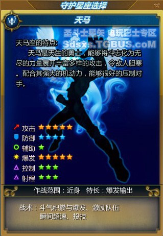 星座守護(hù)可以理解為傳統(tǒng)游戲中的“職業(yè)”。游戲中共有五大星座守護(hù),即我們所熟悉的青銅五小強(qiáng)的星座守護(hù)。每個(gè)星座守護(hù)都有自身的定位,查看下面的人物卡片: