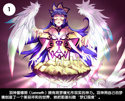 (1)羽神創(chuàng)世羽神蕾娜斯(Lenneth)擁有將夢(mèng)鏡化作現(xiàn)實(shí)的神力。羽神用自己的夢(mèng)鏡創(chuàng)造了一個(gè)美麗祥和的世界,她把那里叫做“夢(mèng)幻國(guó)度”。