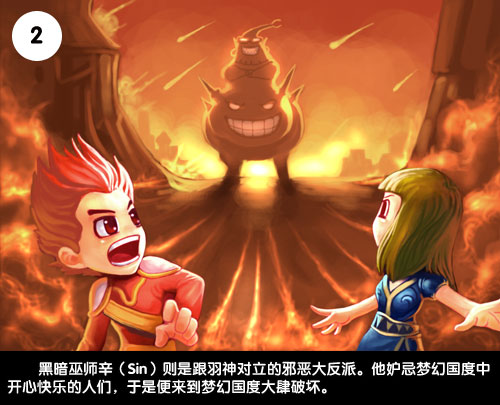 黑暗巫師(Sin)則是跟羽神對(duì)立的邪惡大反派。他妒忌夢(mèng)幻國(guó)度中開(kāi)心快樂(lè)的人們,于是便來(lái)到夢(mèng)幻國(guó)度大肆破壞。