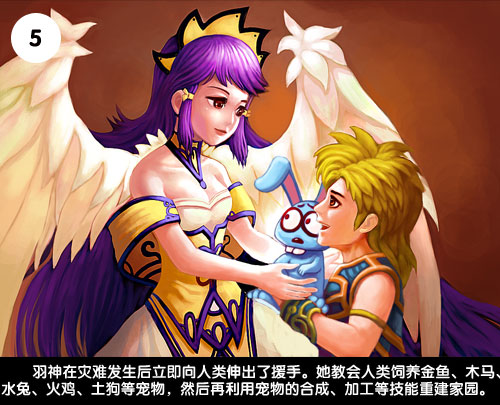 羽神在災(zāi)難發(fā)生后立即向人類伸出了援手。她教會(huì)人類飼養(yǎng)金魚、木馬、水兔、火雞、土狗等寵物,然后利用寵物的合成、加工等技能重建家園。